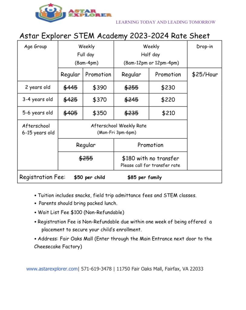 Astar Explorer STEM Academy 2023-2024 Rate Sheet
