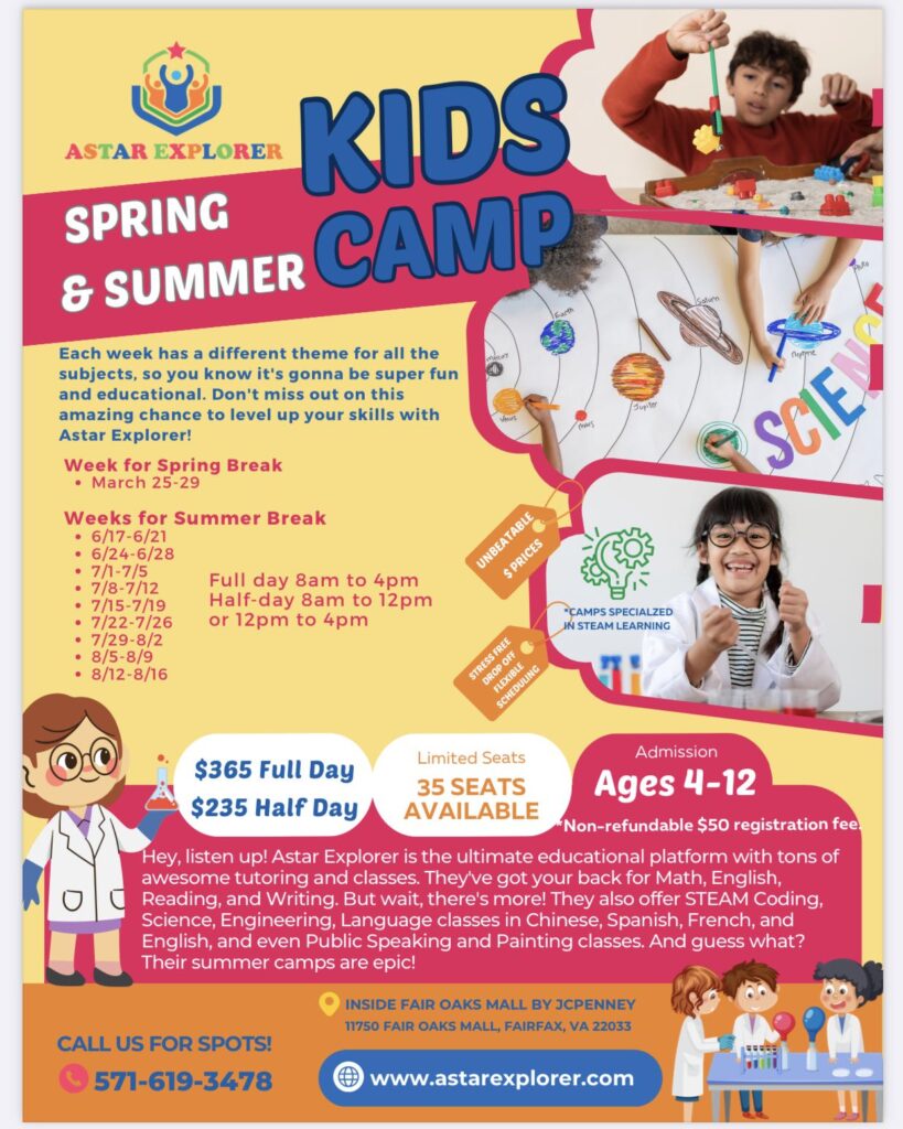 Astar Explorer STEM Academy offers a day camp during the Spring Break and Summer for children ages 2-14. The camp is held at 11750 Fair Oaks Mall from 8 am-4 pm. We offer flexible drop-off and pick-up times for parents who do not need children in attendance for the full day. The camp’s daily schedule includes Science, Math, Spanish, Chinese, English, Arts and Crafts, indoor activities, Yoga, and more.