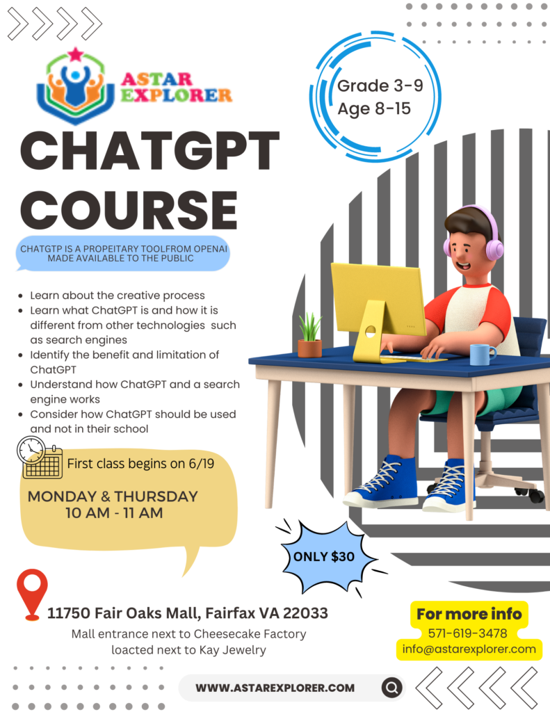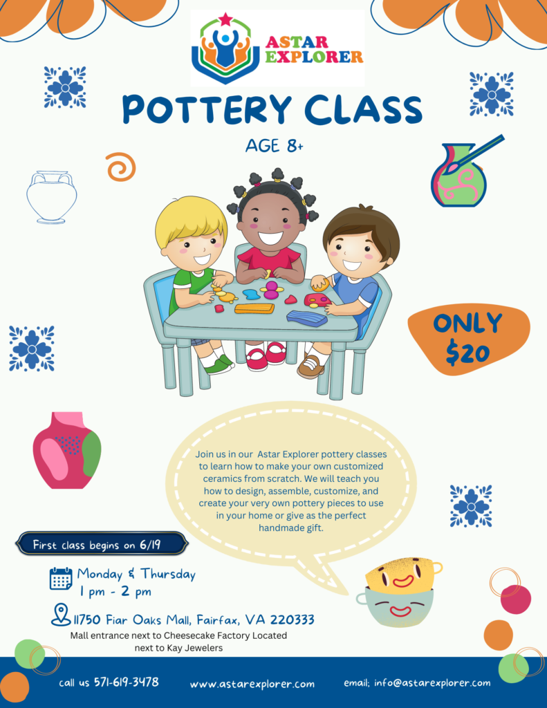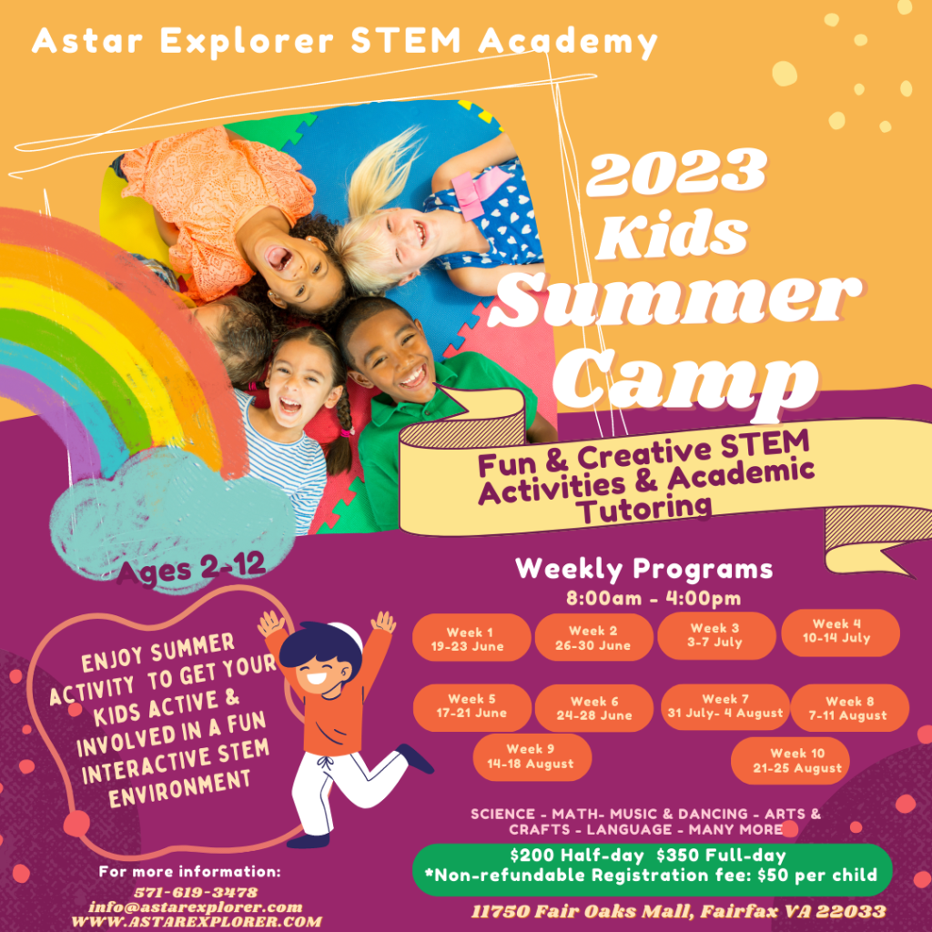 Astar Explorer STEM Academy offers a day camp during the Spring Break and Summer for children ages 2-14. The camp is held at 11750 Fair Oaks Mall from 8 am-4 pm. We offer flexible drop-off and pick-up times for parents who do not need children in attendance for the full day. The daily schedule includes Science, Math, Spanish, Chinese, English, Arts and Crafts, indoor activities, Yoga, and more.